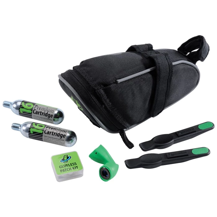 Pssssssssst…thump, thump, thump, thump…!~@$%#! That’s the three stages of a flat tire. But there’s no need to worry. This handy Genuine Innovations Tire Repair & Inflation Seat Bag gives you everything to get that tire up & rolling again. Microflate Nano inflator with Twist-To-Inflate technology is fully controllable, easy to use, & fits inside disc & aero wheels. Nylon seat bag mounts conveniently under your saddle & holds the included tire repair tools, plus a spare tube, cell phone, wallet & keys. Reflective details & tail light tab increase safety at night.